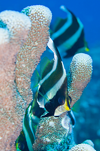 fish; bannerfish; pennant bannerfish; Chordata; Osteichthyes; Perciformes; Chaetodontidae; Heniochus chrysostomus, South Pacific