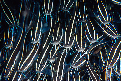 fish; catfish; catfishes; eel-tailed catfish; striped catfish; Chordata; Osteichthyes; Siluriformes; Plotosidae; Plotosus lineatus, feeding behavior, South Pacific