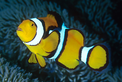 fish; damsel; damselfish; anemonefish; clown anemonefish; Chordata; Osteichthyes; Perciformes; Pomacentridae; Amphiprion percula; symbiotic behavior;