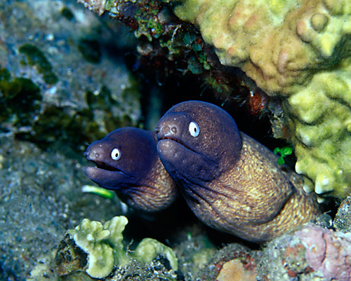 fish; eel; moray eel; white-eyed moray; Chordata; Osteichthyes; Anguilliformes; Muraenidae; Gymnothorax thyrsoideus; sometimes incorrectly identified as Sideria thyrsoidea; two, South Pacific